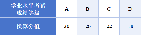 普高招生考生高中学考成绩(满分300分)=各科成绩等级换算分值相加的总和(信息技术与通用技术学考分设的考生,信息技术与通用技术成绩等级换算分值以50%计)。各科成绩等级转换成分数如下表所示: