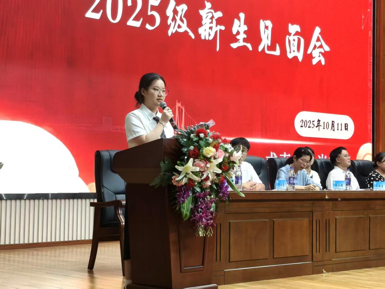 杨琼致开幕辞。她向2025级新生表示欢迎,随后通过建工学院在各类学科竞赛、技能比拼中斩获的累累硕果,展现学院的学科实力与育人成效,让他们在踏入校园之初,便深刻感受到作为“建工学子”的自豪感。